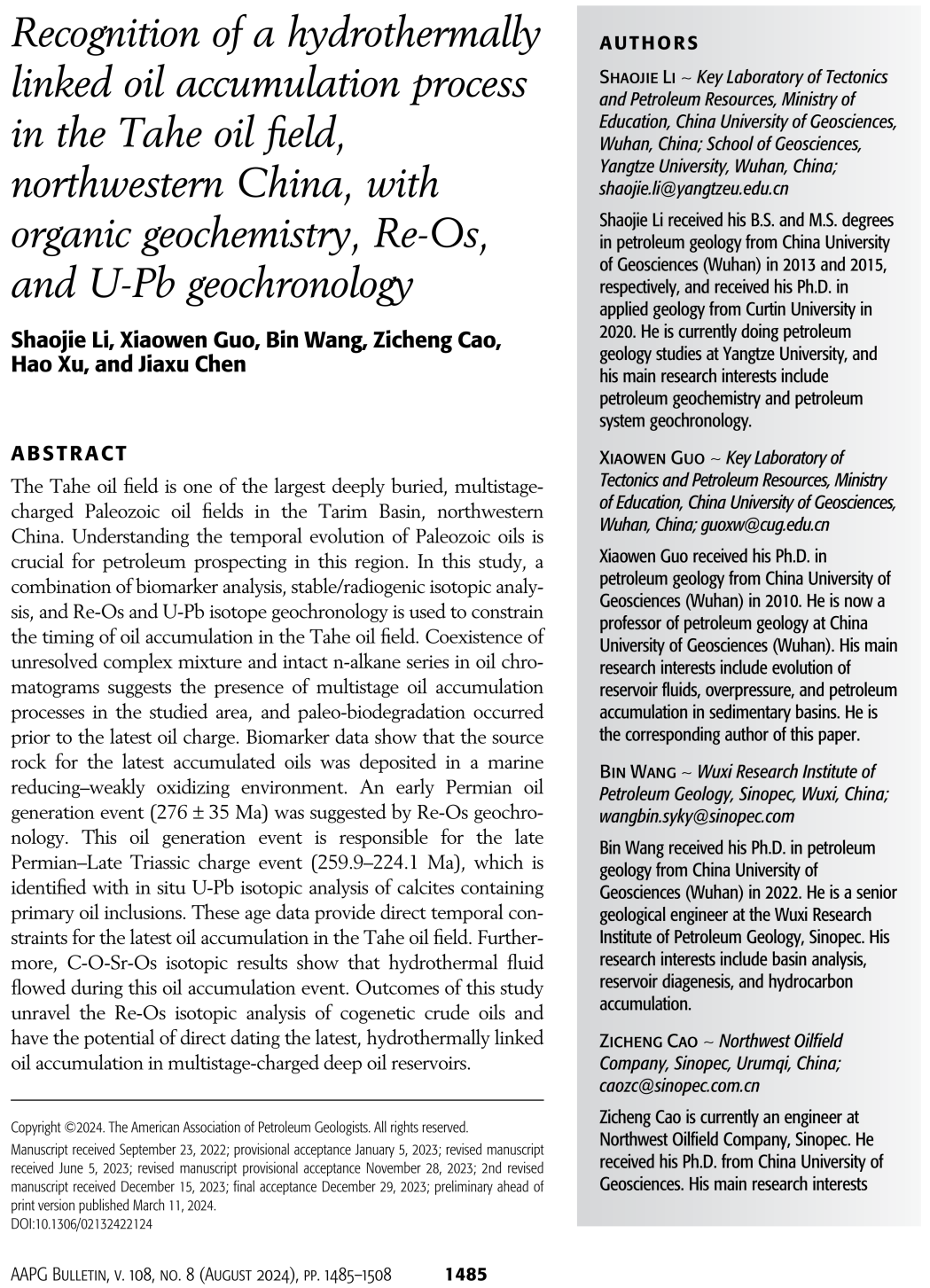 石油系李劭杰博士在石油地质学领域主流期刊《AAPG Bulletin》上发表题为“Recognition of a hydrothermallylinked oil accumulation processin the Tahe oil field,northwestern China, withorganic geochemistry, Re-Os,and U-Pb geochronology”的研究论文。
