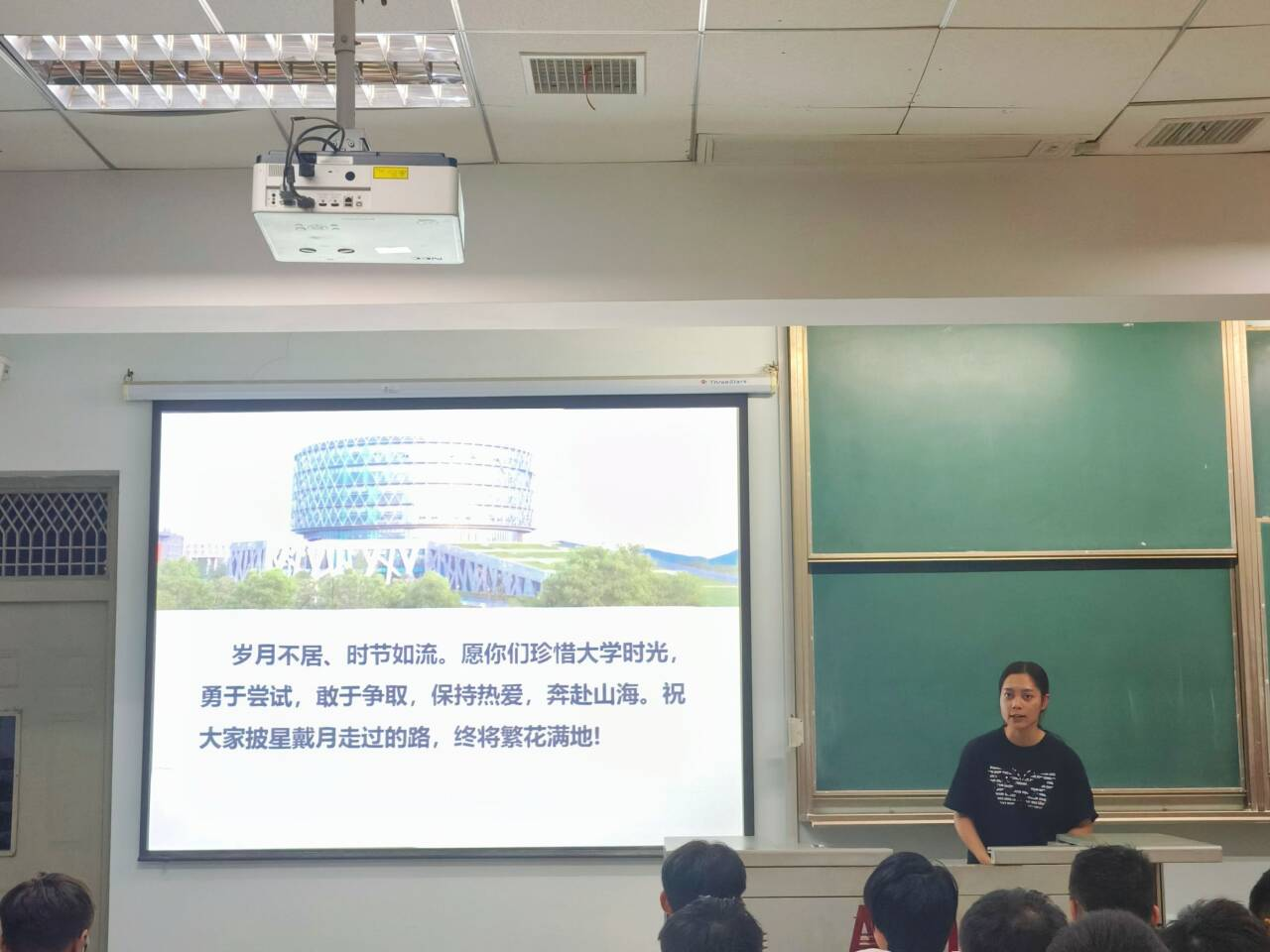 优秀学生代表蓝婉嫣通过自身经历向学弟学妹们传授学习经验,从大一基础课程学习的重要性到如何合理规划大学生活。鼓励同学们在大学四年中勇于尝试、敢于争取、保持热爱、奔赴山海!