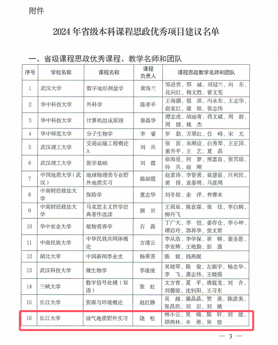 《油气地质野外实习》课程首次获批“省级课程思政优秀课程”,课程团队荣获“省级课程思政教学名师(团队)”,这也是迄今为止我校获批的5门省级课程思政优秀项目中唯一一门实践类课程。