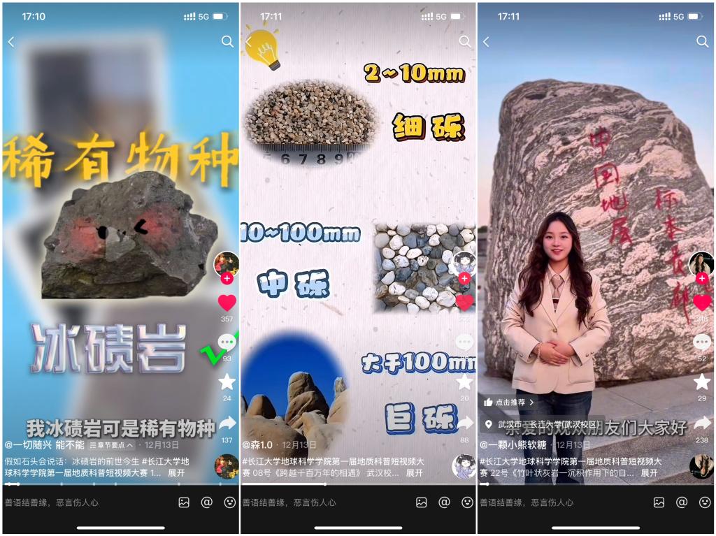 大赛要求参赛作品以中国地层标本长廊(武汉校区)和长江三峡地层标本长廊(荆州东校区)中的一块岩石为载体,围绕该岩石及其所在地层的地质现象、形成过程、古环境、古生物特征及古构造演变等一个或多个方面进行科普创作。此次比赛吸引了来自东校区与武汉校区超过百名学生的热情参与,共提交了27部高质量的原创地质科普短视频作品。在专业教师的指导下,各参赛队伍从冰碛岩的历史变迁到竹叶状灰岩的成因探索;从沉积作用到火山活动的影响;再到海陆变迁以及地质灾害等多个角度出发,制作出了既通俗易懂又富有创意且形式多样的短视频内容。评审环节分为专家评审打分及公众评审两部分。其中,由高达老师与郭霖老师联合邀请跨学科领域的多位教师组成评委会,依据科学性、普及性和艺术表现力等因素对每部作品进行全面评估。而大众评审则基于抖音平台上视频点赞数、转发量及网络投票结果来决定。截至发稿时止,所有参赛视频在抖音上的总播放量已超过9万次,并获得超过6000个赞。