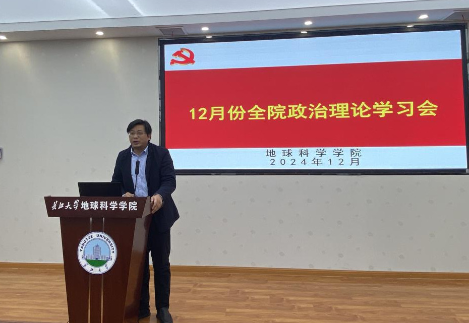 会议第三阶段,党委书记杨全辉带领全院教职员工进行政治理论学习,他号召全院教师团结起来,坚定发展信心,在2025年学校冲击世界一流学科的关键之年做出地科老师应有的贡献。