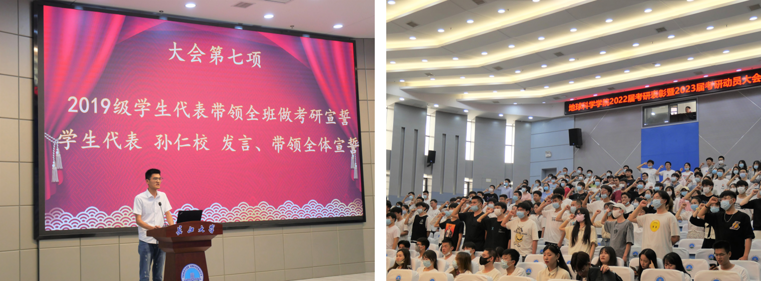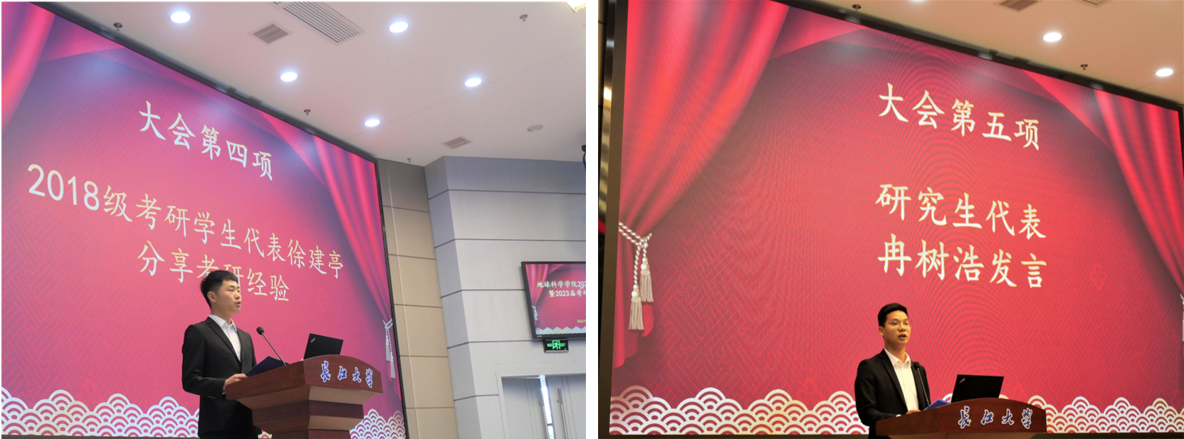 接着,2022届考研学生代表徐建亭和研究生代表冉树浩先后上台分享考研经验和学习经验。去年今日,徐建亭作为学生代表在此带领全体18级同学进行考研宣誓,如今他如愿以偿被中国地质大学(武汉)录取,他说:“漫漫考研路,初心很重要,我们要明白自己考研的目标。”冉树浩回顾了自己在长大度过的七年时光,勉励学弟学妹们:“坚定理想信念,培育高尚品格,练就过硬本领,勇于创新创造,矢志艰苦奋斗,在实现中华民族的伟大复兴的进程中书写自己的青春赞歌!”临近毕业,他们也表达了对母校、老师和同学的感恩和不舍。