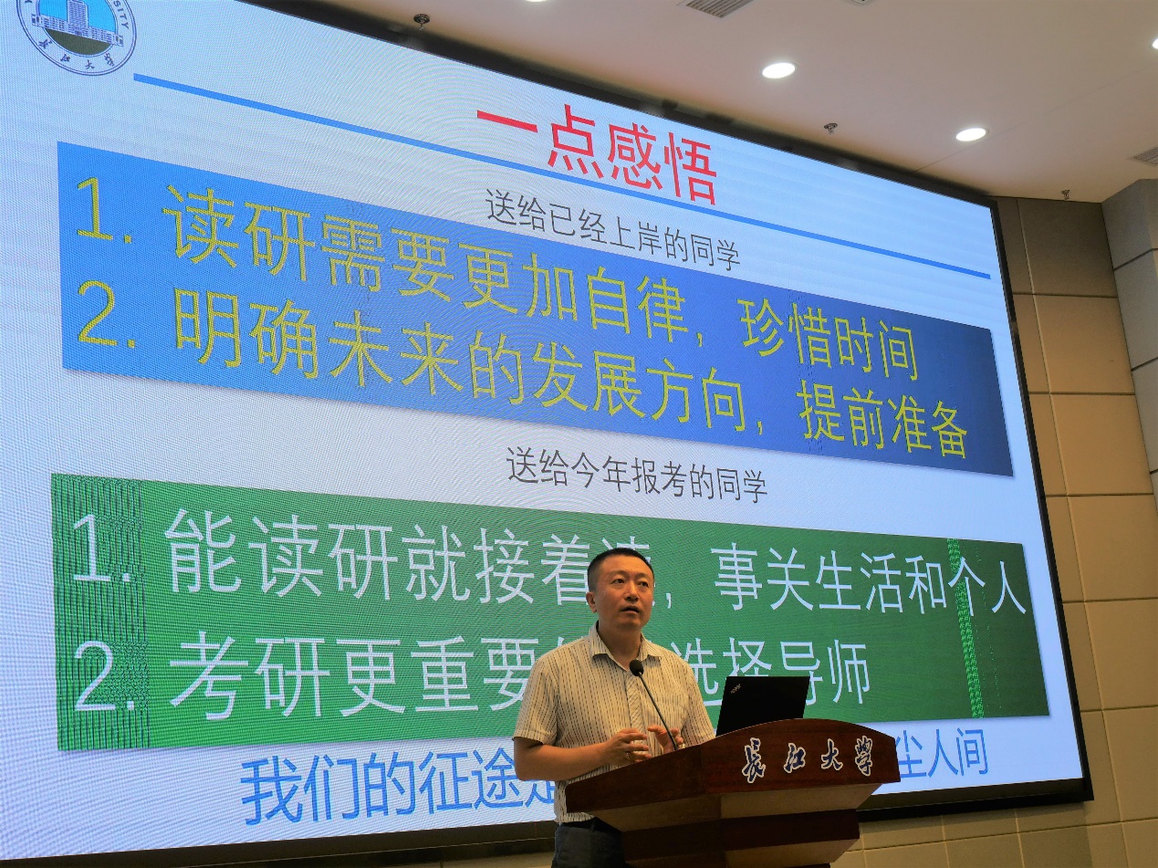 最后,院长胡明毅总结。他首先对考上硕士研究生的同学们致以最热烈的祝贺,鼓励准备考研的同学们“坚定信心,持之以恒,有志者事竟成!”相信同学们在这一年的奋勇拼搏中终能金榜题名,大家一“研”为定!