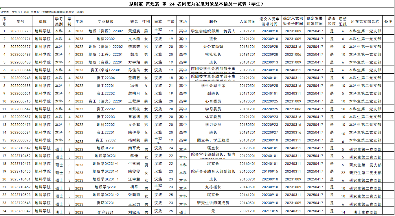 经党支部培养教育和考察,在听取培养联系人、党员和群众意见的基础上,经支部委员会会议讨论决定并报上级党委备案同意, 2025 年 4 月 17日确定 黄煜宸 等 24 名同志为发展对象。为保证发展新党员的质量,加强对发展党员工作的民主监督,现对发展对象进行公示。