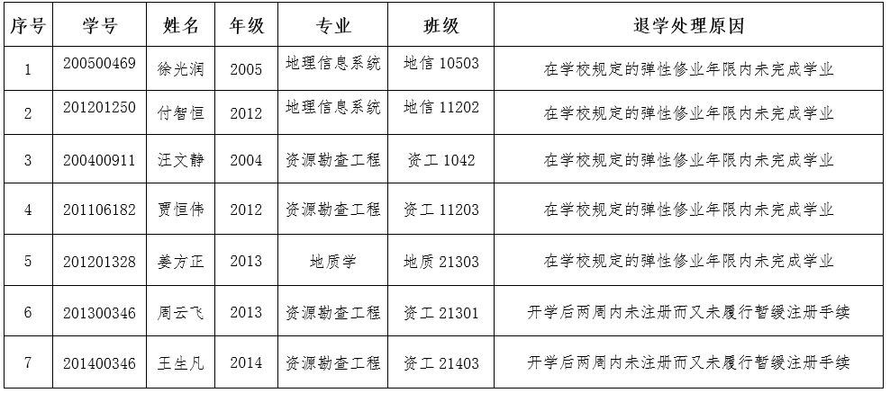 普通本科生学籍管理办法》(长大校发〔2017〕134号)第五十一条规定,对达到退学处理条件但拒绝办理退学手续或多种方式均无法联系到本人的本科生,现以公告方式送达拟退学处理告知书,公告时间7个工作日,于2021年6月2日结束公告。在公告期内,学生可向学院提出申辩和书面陈述并署真实姓名、联系方式,邮寄或直接送到嘟嘟成人网