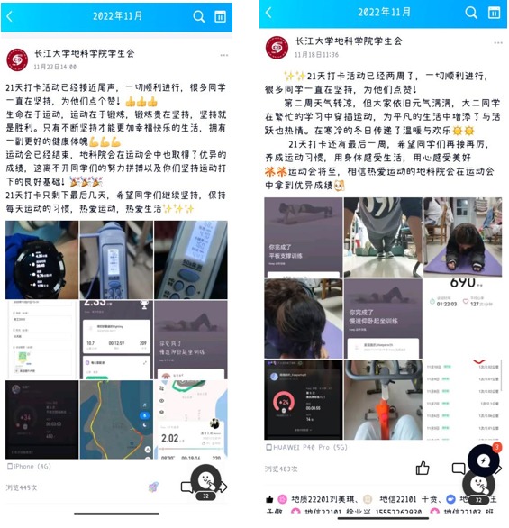 大家每天在活动QQ群内晒出自己的运动照片、视频、运动APP截图等,交流运动心得,分享健康运动方式,大家互相监督、互相鼓励,增强了每日运动的主动性和积极性。打卡群内日日消息不断,各式各样的运动照片展现了大家热爱生活、健康向上的精神风貌和青春活力。学院对打满21天的同学准备了精品奖品,打卡天数累计14以上的同学均有第二课堂学分奖励。