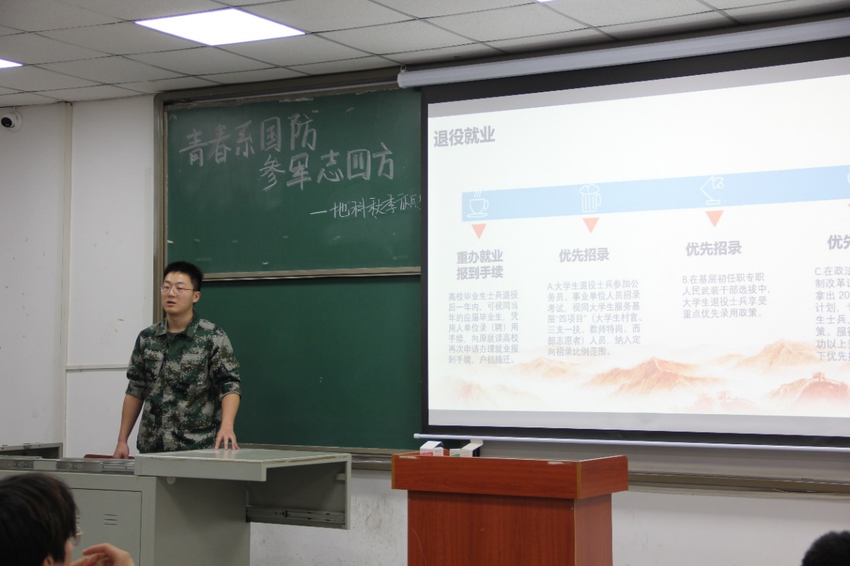 学生参军入伍热情,5月22日晚7时,2023年秋季征兵动员宣讲会于武教B-206举行。会议由辅导员张严老师主持,由退伍士兵、军旅之家成员孙家振、杨维鑫主讲,各班班长、团支书、宣传委员以及部分意向应征入伍的学生参会。