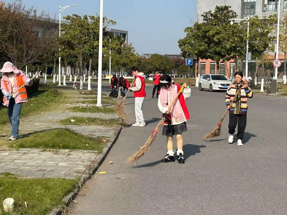 下午两点,志愿者们早早地到达集合地点拿好劳动工具,跟随清洁阿姨的脚步有序前往知音路、子期路等学校主干道进行落叶清扫。在“师傅们”的耐心指导下,大家很快掌握了清扫落叶的要领,大家分工明确,密切合作,有的同学用扫帚收拢落叶,有的同学撑起编织袋,还有的同学徒手将树叶捧装到编织袋里。大家挽起袖子齐动手,既认真又细心,两个小时过后,原本布满落叶的路面焕然一新。