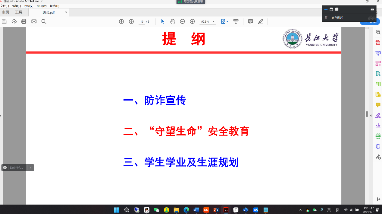 随后,在“守望生命”安全教育部分,老师们首先向大家强调离校必须请假,如因出差、联培、延毕、考试等原因需离校,必须找辅导员办理请假手续,安全第一位。紧接着从防盗、消防、维护国家安全、校园内部交通、防外部滋扰以及网络安全六个方面入手,通过讲案例、看视频,提醒学生吸取经验教训,牢记辅导员、班主任及校园报警求助电话,遇到任何安全问题应及时与老师、学校联系,时刻注意保护自身安全。