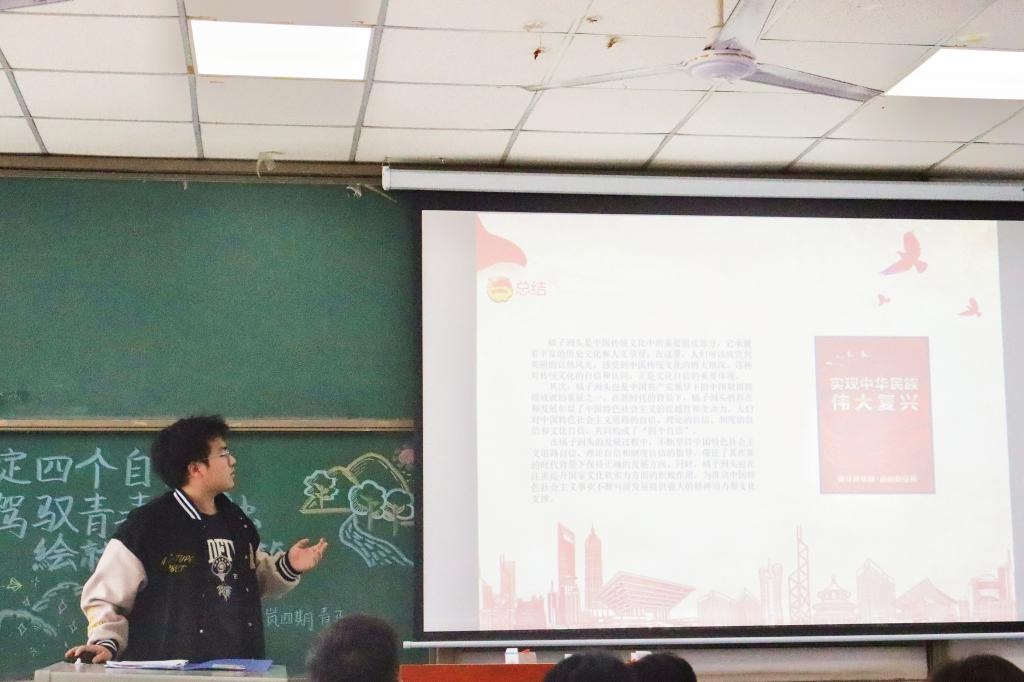 百年征程波澜壮阔,百年初心历久弥坚。何卓远同学分享了研学橘子洲头时的所闻所感,“独立寒秋,湘江北去,橘子洲头”,矗立在伟人曾在此眺望的地方,心中比湘江更澎湃的是作为中华儿女的精神血脉;苏佳芮同学分享了走访八路军驻兰州纪念馆的见闻,纪念馆内的一件件珍贵革命文物和一张张历史照片,无一不在动情讲述着那段峥嵘壮阔的革命史。成星星同学对“四个自信”的内涵做了深刻阐述,并探访了家乡苏维埃政府遗址,在实践中体会共产主义精神内涵。