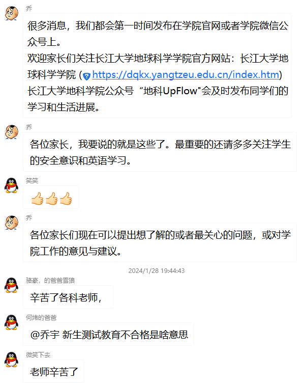 23级本科生家长群热闹非凡,学工办全体老师与家长们齐聚一堂,召开了23级本科生2023年秋季学期期末家长会。辅导员乔宇老师以“文字+图片”的形式,从“学生活动、学业成绩、学风建设”三个方面展示了同学们在校期间的学习与生活,家校携手助力学生成长。