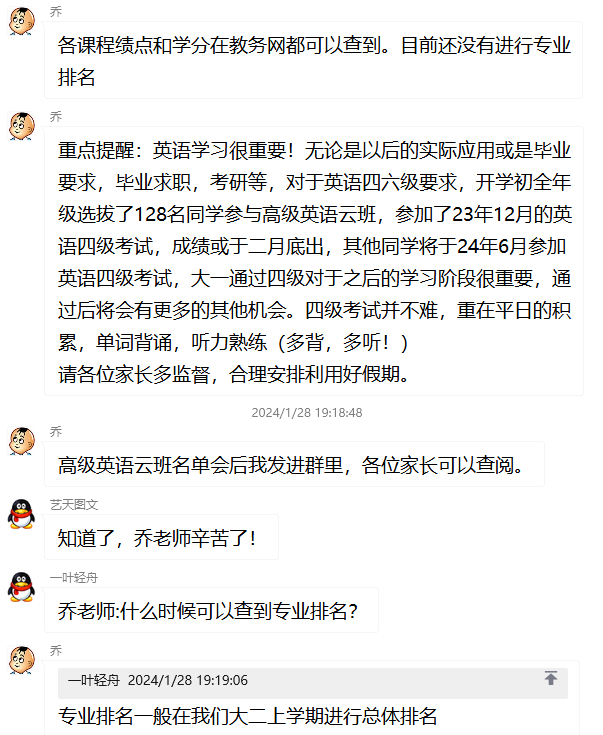 针对英语学习,乔老师重点提醒其在就业、考研中的重要性:本学期选拔128名学生参与高级英语云班,已参加2023年12月四级考试,成绩预计2月底公布;其余学生将在2024年6月参考,建议家长督促学生利用假期积累词汇、练习听力。