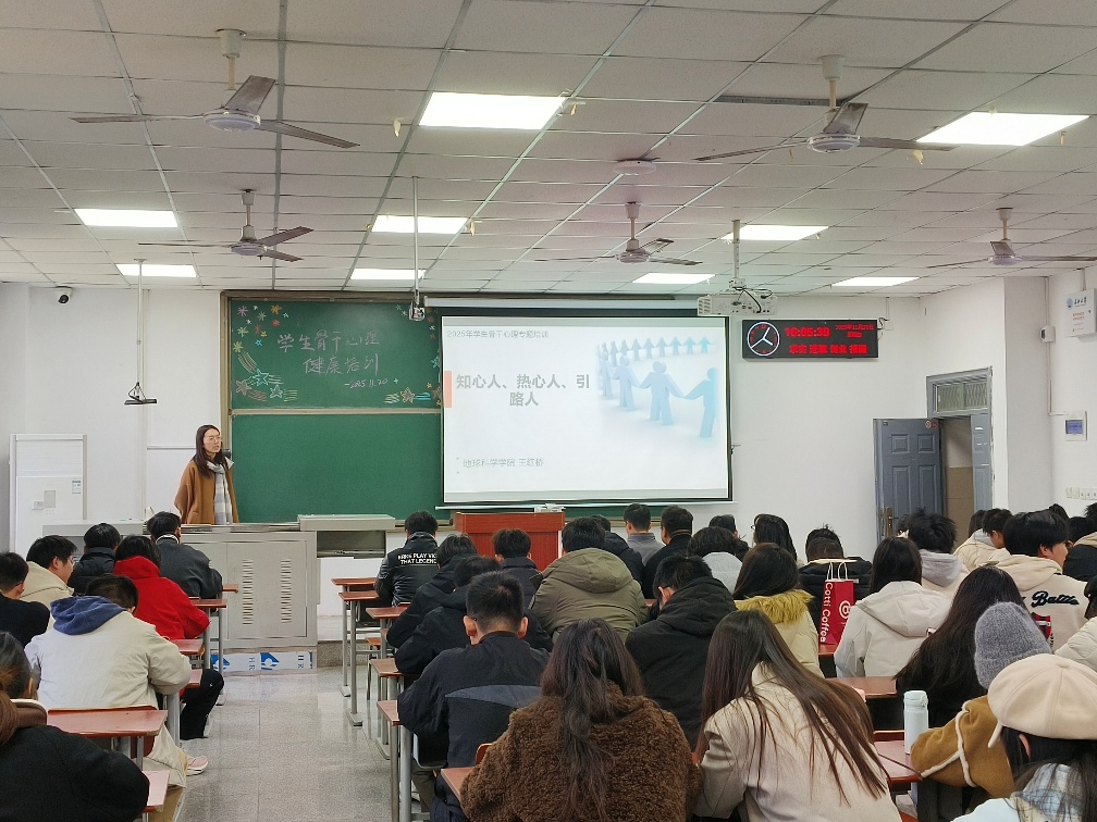 学工办王红桥、黄瑱老师分别在武教A103和东校区12教102开展心理健康专题培训。2025级160余名本、研究生学生骨干参训。