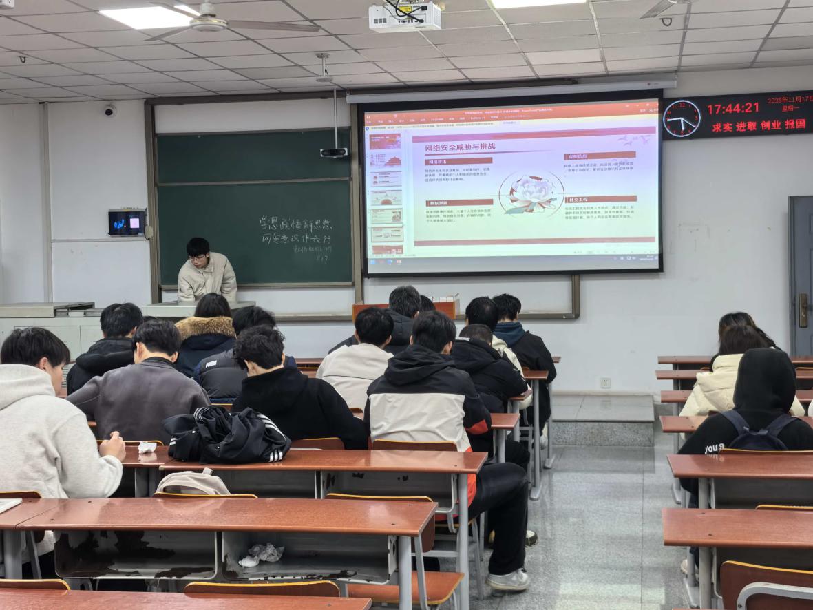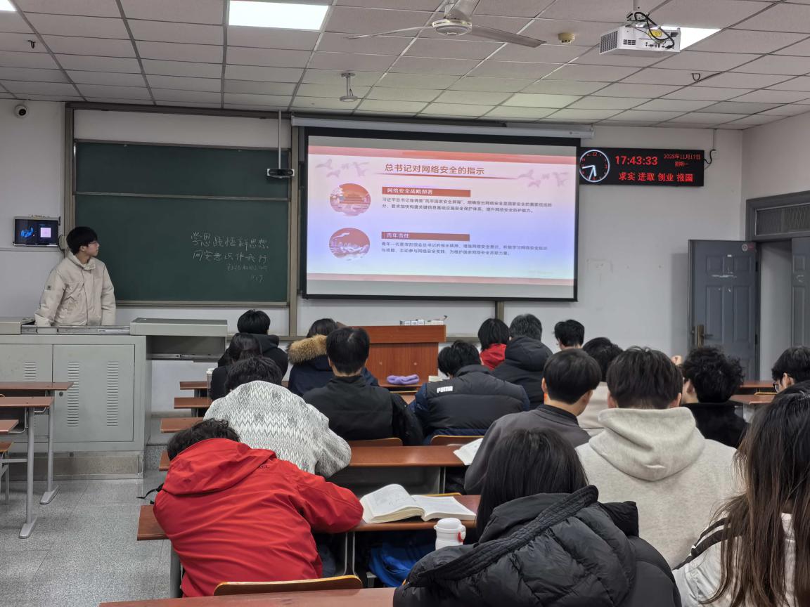 (通讯员 卜文杰)为深入学习贯彻党的二十届四中全会精神,落实共青团关于青年思想引领与安全素养培育的工作要求,11 月17日,资工(石油之光)22401 支部在武教 A209 开展 “学思践悟新思想,网安意识伴我行” 主题团日活动,支部全体团员参与此次活动,在理论学习与实践交流中凝聚青春共识。