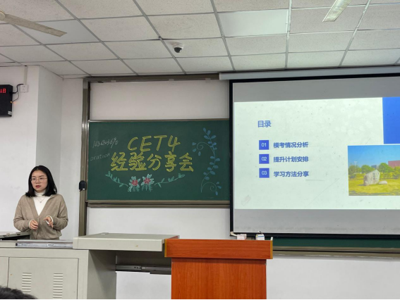 大会伊始,郭老师对4月8日组织的第一次四级模考情况进行了通报,指出了同学们普遍存在的问题,并且再次向大家阐述了四级证书的重要性。随后,郭老师向同学们具体介绍了学院为大家精心制定的“助力四级 成就梦想”系列活动安排,倡议以班为单位建立学习小组,分班制定学习计划并落实。她鼓励同学们珍惜每次学习机会,用“坚持”与“高效”备战英语四级。