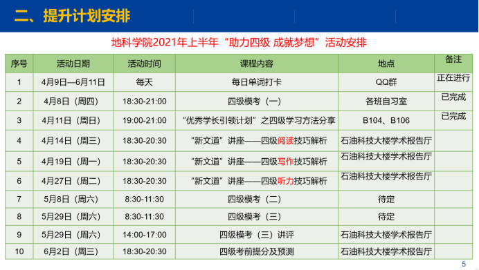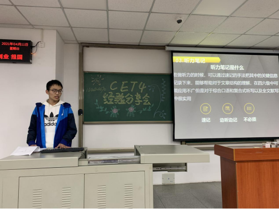 于4月11日晚19时分别在武教B-104和B-106教室举行了“2020级四级动员大会”。大会包括模考情况分析、提升计划安排和“学长学姐引领计划”之四级学习方法分享三个方面的内容,嘟嘟成人网