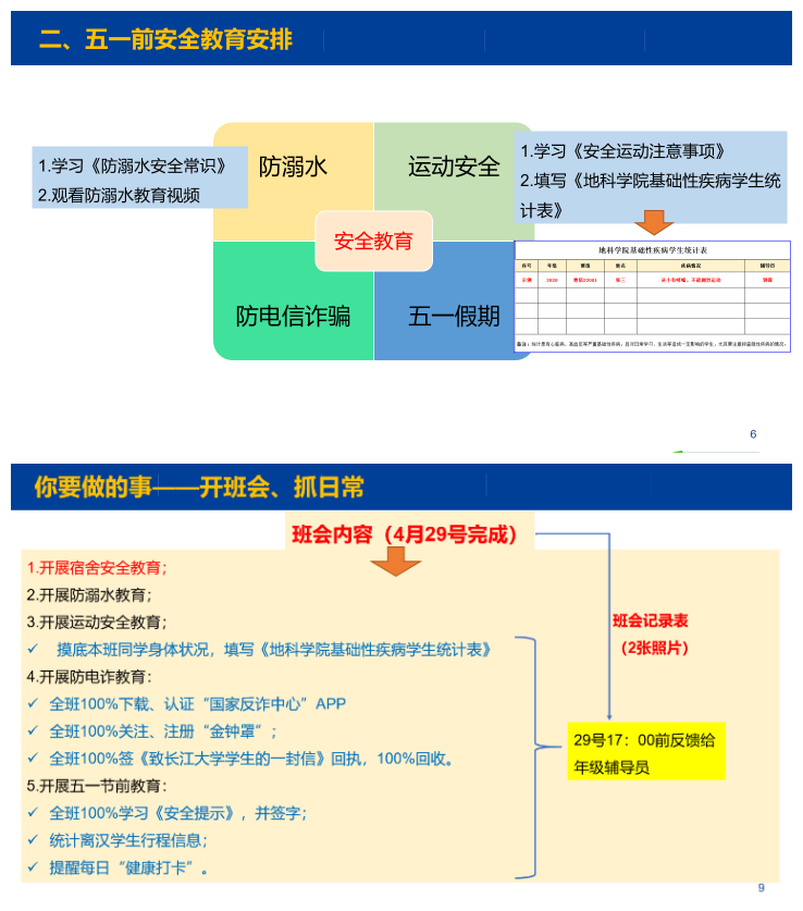 学生宿舍使用违规电器和晚归情况,并对事件危害进行了分析,提醒大家务必遵守学校相关规定,安全高于一切。二是五一假期安全。要求各班班长召开安全主题班会,在班会上做好防溺水、运动安全、防电信诈骗和五一假期安全四个方面的教育,重点做好“国家反诈中心”APP和微信公众号“金钟罩”的下载与认证、假期离汉学生的行程登记、假期安全教育告知书的签收等。