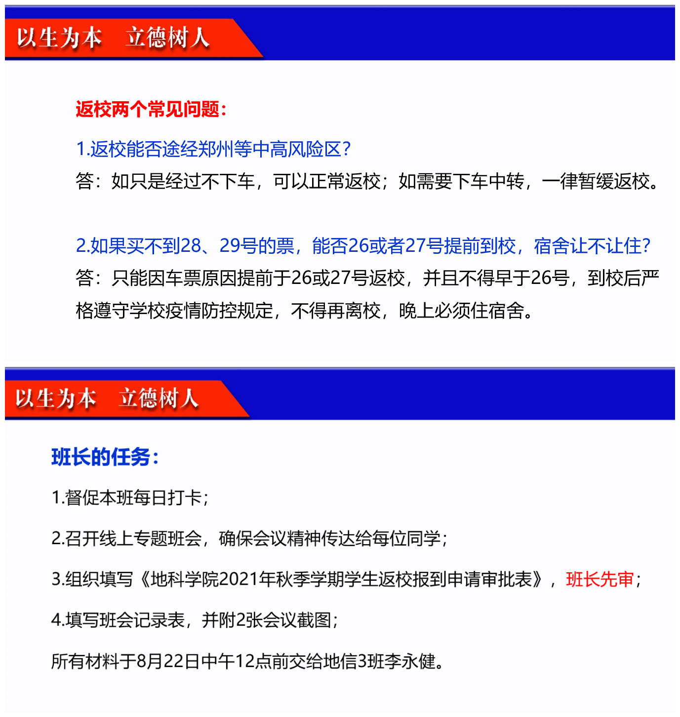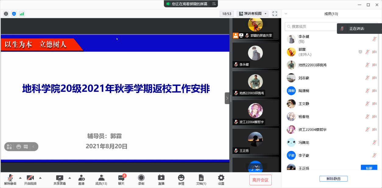 2021年秋季学期返校工作安排”主题班会。