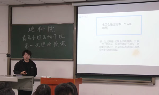 接下来由地质(资源)22001班的王飞扬详谈团会举办问题。生动形象地以标题为“团会那些事儿”为出发点开始讲解团会开展方面的问题,想要顺利开展团会需要注意的以下几个重点要素:主题明确、内容集中、形式新颖、准备充分。全程构思新颖,视角独到,为同学们的团会组织能力开了剂猛药。