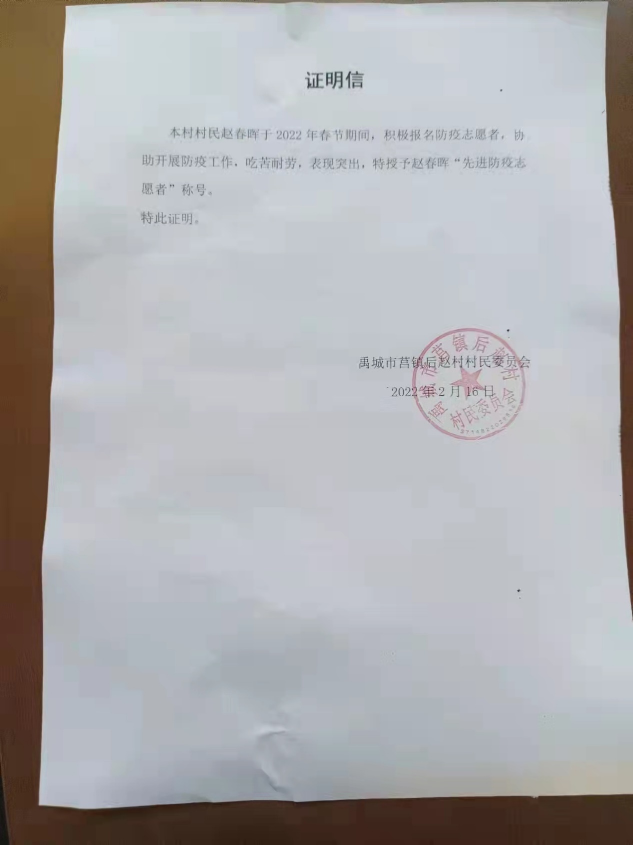 资环QZ201赵春晖在去年寒假时就曾参与到了抗疫志愿者的工作中,今年也不例外。刚刚过完春节,山东的天气还是非常寒冷,但是他还依旧坚守在防疫的值班岗上。核查外来返乡人员和登记他们的信息是他每天的日常工作。遇到口罩戴得不规范的爷爷奶奶,他一边科普防疫基本知识,一边演示如何正确佩戴口罩,提醒着:“爷爷奶奶,平时一定要注意戴好口罩啊。”他觉得,虽然大家在热热闹闹过年,但是防疫也一刻不能松懈。他觉得每个人都献出自己的一份力量,众志成城,一定能打赢这场防疫保卫战。因为出色表现,他被村委会授予了“先进防疫志愿者”称号。