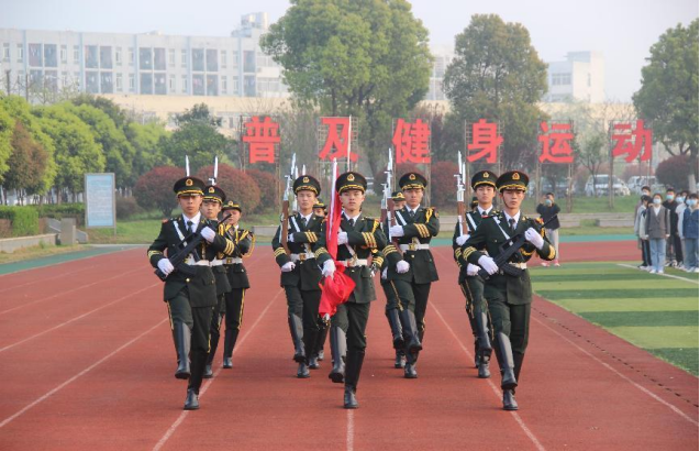国护队精神抖擞,迈着整齐的步伐,喊着铿锵有力的口号,护送着鲜艳的五星红旗。