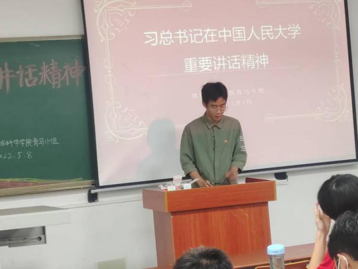 “青岚”二组的吕品扬同学结合自身实际分享了自己的感悟,认真思考总书记强调的那句“为谁培养人、培养什么人、怎样培养人”,他认为身为一名地质专业的学生,要努力学习好专业知识,用自己的专业能力去丈量我们脚下的每一块土地。