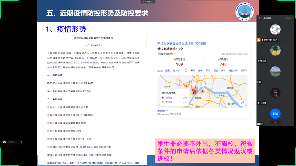 为应对当前严峻的疫情防控形势,做好国庆节及秋季学期安全教育,提高同学们的安全防范意识,根据研工部的统一部署,嘟嘟成人网 于9月29日通过线上召开研究生安全教育主题班会。