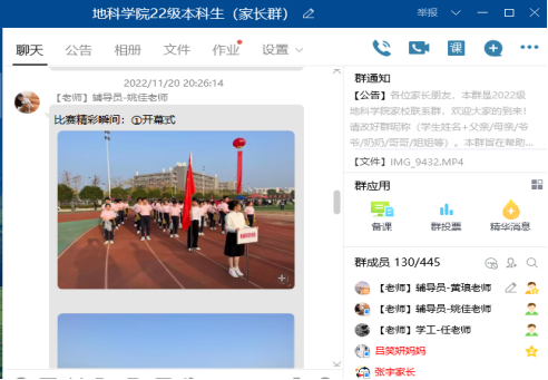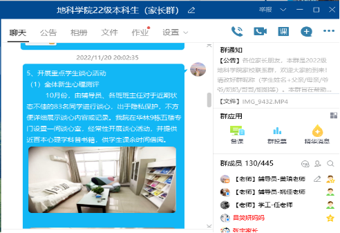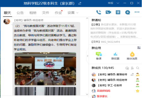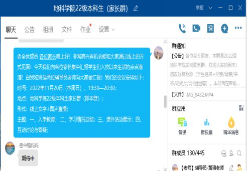 于11月20日晚7时30分通过QQ群,召开线上2022级本科新生家长会。学院党委副书记任倩、年级辅导员黄瑱、姚佳及300余名新生家长参会。