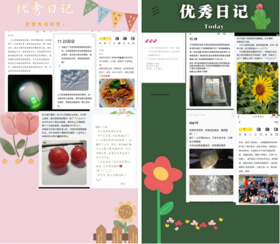 打开电子手账,同学们或是谈学习的收获“手电筒照射下的萤石,非常非常漂亮”、“听了我与教授面对面,老师讲得好好,还拿到了亲笔签名,对未来充满希望”,或是分享吃货的快乐“食堂叔叔打菜的时候,怕冷了专门用微波炉加热,怕我吃不饱,还加了一个鱼糕”,有令人会心一笑的反转“做核酸志愿者,穿着防护服真挺闷的,但是盒饭里的糖醋鱼真好吃”,也有细腻的感受“今天看见几朵懒散的云,好想舒舒服服的躺在上面,好像棉花糖一样,我可以吃好多”,以及劳动的充实“清扫校园,累并快乐着!”虽未谋面,但同学们对生活的热爱跃然纸上,真挚的表达,引得更多同学闻讯陆续加入。