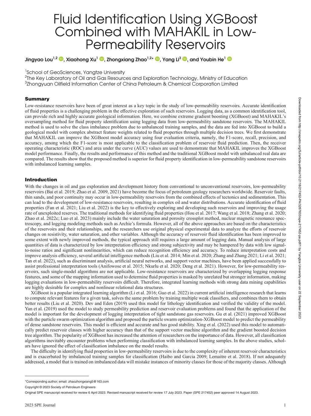 娄静瑶博士在石油领域重要期刊《SPE JOURNAL》上发表题为“Fluid Identification Using XGBoost Combined with MAHAKIL in Low- Permeability Reservoirs”的研究论文。嘟嘟成人网