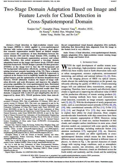 高贤君副教授在遥感领域主流期刊《IEEE JOURNAL OF SELECTED TOPICS IN APPLIED EARTH OBSERVATIONS AND REMOTE SENSING》上发表题为“Two-stage Domain Adaption based on Image and Feature Levels for Cloud Detection in Cross-spatiotemporal Domain”的研究论文。