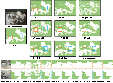 该研究主要针对有限样本的云检测语义分割模型无法保证源域(SD)和目标域(TD)之间数据分布的一致性,导致跨域分割精度和鲁棒性能力下降。因此,本文提出了一种基于图像和特征层的两阶段域自适应(TDAIF)云检测框架。TDAIF (图1)在图像层设计了一个伪目标域数据生成器(PTDDG),有效融合标清前景和标清背景信息,辅助模型挖掘标清的不变语义知识。然后,在特征层面探索了一个域判别和自组装联合(DDSEJ)框架,隐式地处理全局特征的对齐和决策边界-局部特征的优化。TDAIF 最终削弱了图像辐射多样性和尺度发散的影响,提高了跨时空数据的自适应处理能力。在三个域传输数据上对 TDAIF 进行了横向和内部对比实验。实验结果表明,TDAIF 显著降低了跨域网络精度损失。与 CycleGAN 和 AdaptSegNet 相比,IoU 提高了约 30%。TDAIF 的表现优于最先进的计算视域适应方法,这表明从图像到特征层的分层数据对齐非常有效(图2)。