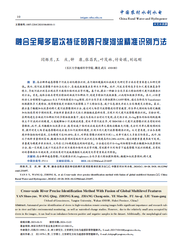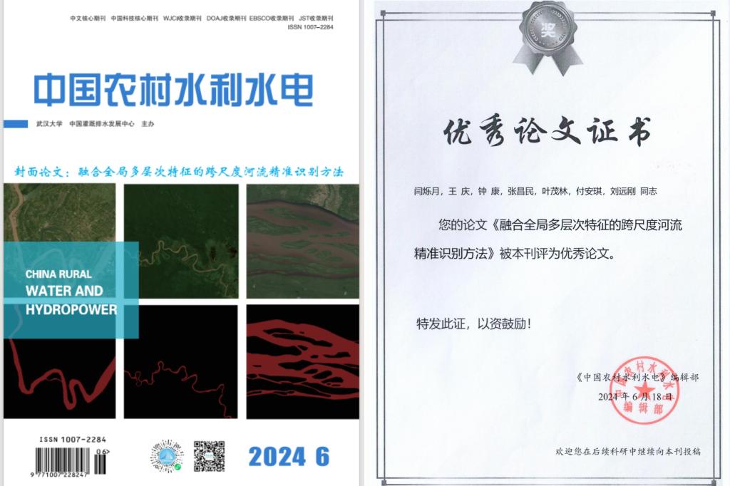 地信系硕士研究生闫硕月(指导老师:王庆)在《中国农村水利水电》上发表题为“融合全局多层次特征的跨尺度河流精准识别方法”的研究论文。该论文被该期刊评为优秀论文,并作为2024年第6期的封面论文。
