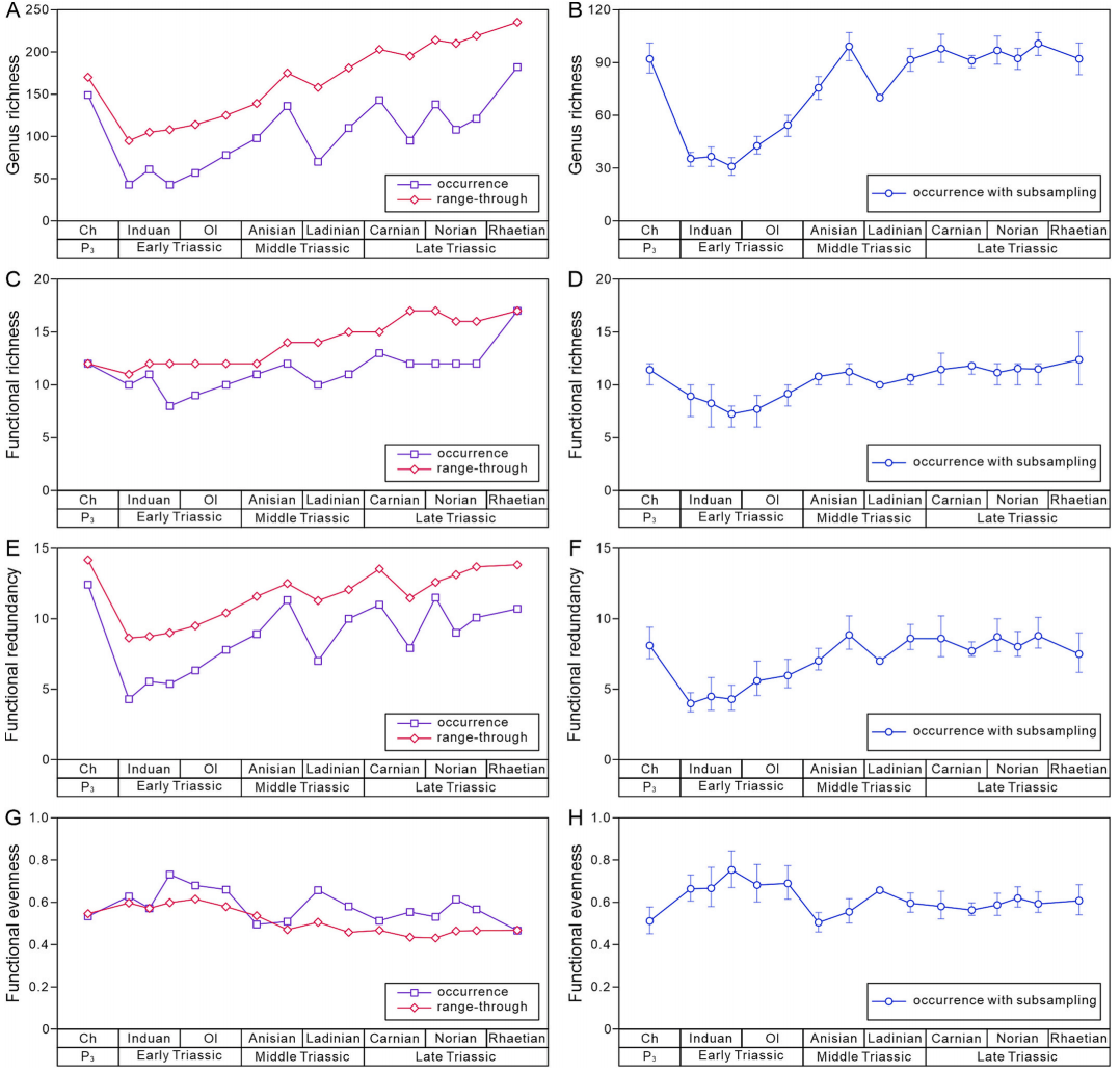 二叠纪-三叠纪之交的生物大灭绝是显生宙以来规模最大的灭绝事件,伴随着物种多样性的巨大损失,功能多样性是如何演化的呢?其与物种多样性有何关系?对功能多样性这样一个生物多样性的全新指标的深入研究,有助于加深对生物灭绝与复苏的理解和认识,为当代生态系统保护提供经验教训。论文选取晚二叠世至晚三叠世的双壳类作为研究对象,建立了一个全球双壳类化石数据库,识别出了19种双壳类生态功能群。结果表明,二叠纪-三叠纪之交生物大灭绝中双壳类功能丰富度和属丰富度的变化是不耦合的,属丰富度仅受到中等程度的下降,而功能丰富度几乎不受影响;同时,大灭绝导致双壳类的功能冗余度下降,功能均匀度上升,这可能是双壳类能够抵抗大灭绝影响的原因。此外,新的双壳类功能群的出现、內栖类双壳类的占比提高等指示双壳类在捕食/竞争等压力下表现出功能空间的扩展,对生态空间和资源利用能力大幅增强,指示中生代海洋革命可能在晚三叠世卡尼期已经开始。
