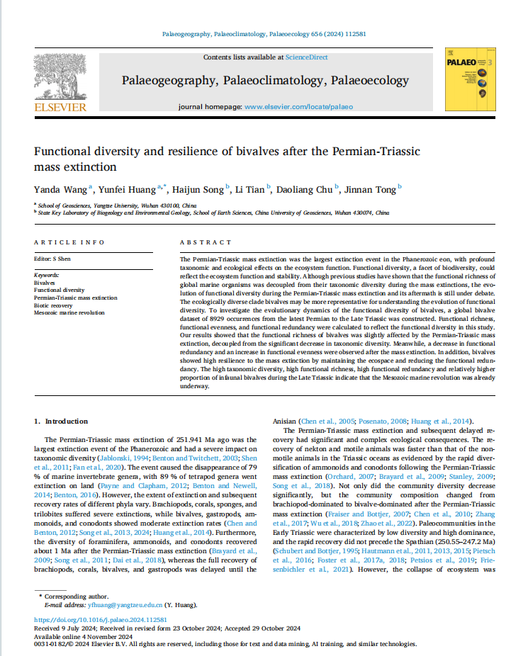 黄云飞教授团队长期从事古-中生代之交重大地质转折期生物灭绝与生物复苏方面的研究,团队成员王延达在古生物学国际1区SCI期刊《Palaeogeography, Palaeoclimatology, Palaeoecology》上发表题为“Functional diversity and resilience of bivalves after the Permian-Triassic mass extinction”的研究论文。嘟嘟成人网
