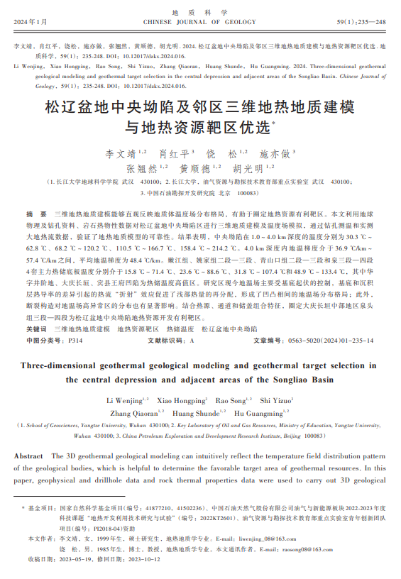 硕士生李文靖在《地质科学》上发表了题为“松辽盆地中央坳陷及邻区三维地热地质建模与地热资源靶区优选”的研究论文,采用三维地热地质建模方法,优选松辽盆地中央坳陷及邻区地热资源靶区。嘟嘟成人网