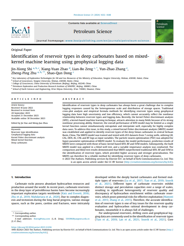 石油系教师史今雄博士在石油领域重要期刊《Petroleum Science》上发表题为“Identification of reservoir types in deep carbonates based on mixed-kernel machine learning using geophysical logging data”的研究论文。本项研究得到了国家自然科学基金项目和湖北省自然科学基金项目的资助。