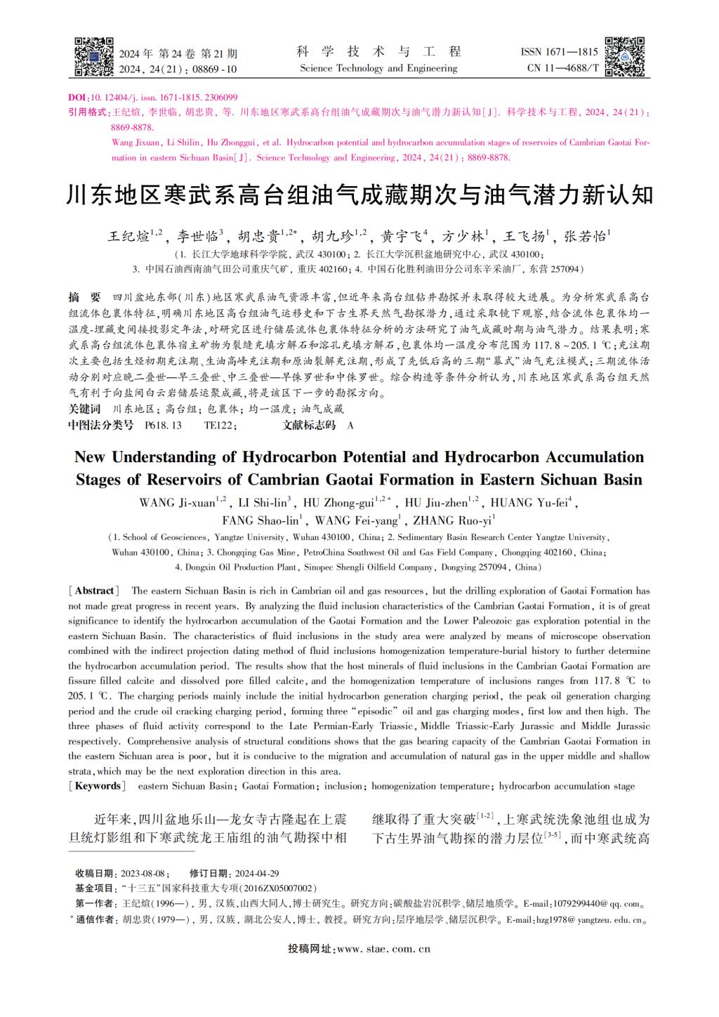 20级硕士研究生王纪煊在期刊《科学技术与工程》上发表题为“川东地区寒武系高台组油气成藏期次与油气潜力新认知”的研究论文。嘟嘟成人网