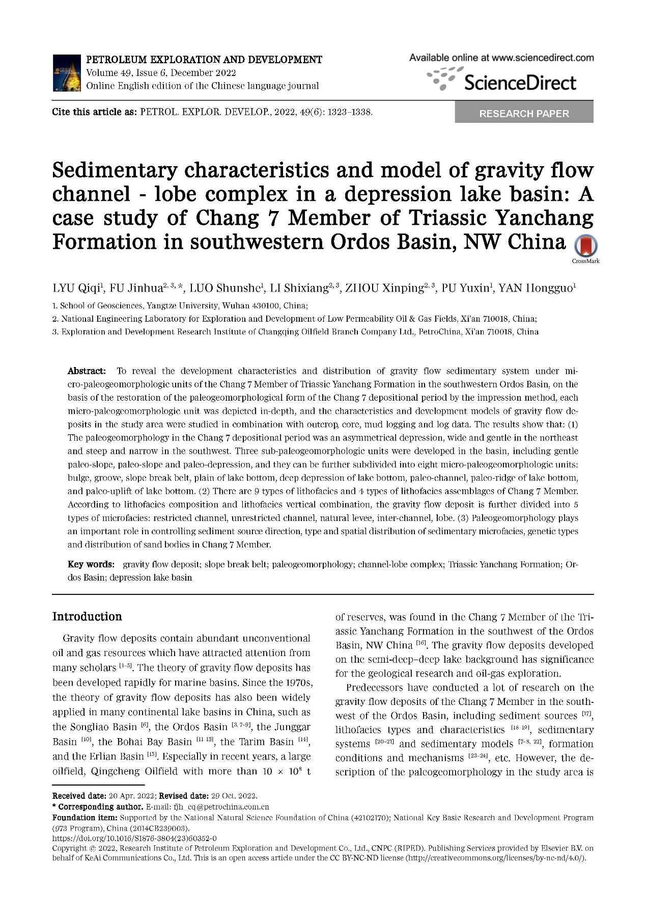 教师吕奇奇副教授以第一作者身份在石油领域重要期刊《Petroleum Exploration and Development》发表题为《Sedimentary characteristics and model of gravity flow channel - lobe complex in a depression lake basin: A case study of Chang 7 Member of Triassic Yanchang Formation in southwestern Ordos Basin, NW China》的研究论文,该项研究得到了国家自然科学基金项目和国家重点基础研究发展计划“973”项目的资助。