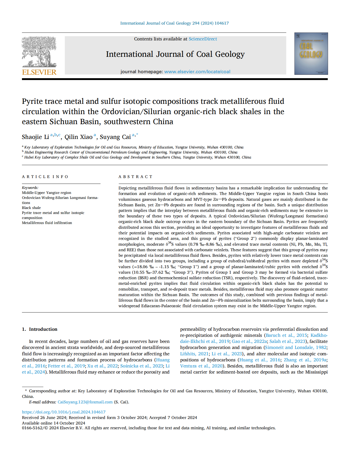 石油系李劭杰在煤田地质学领域主流国际SCI期刊《International Journal of Coal Geology》上发表题为“Pyrite trace metal and sulfur isotopic compositions track metalliferous fluid circulation within the Ordovician/Silurian organic-rich black shales in the eastern Sichuan Basin, southwestern China”的研究论文。