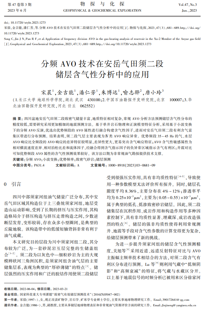 硕士生宋晨在地球物理领域期刊《物探与化探》期刊发表题为“分频AVO技术在安岳气田须二段储层含气性分析中的应用”的研究论文。嘟嘟成人网