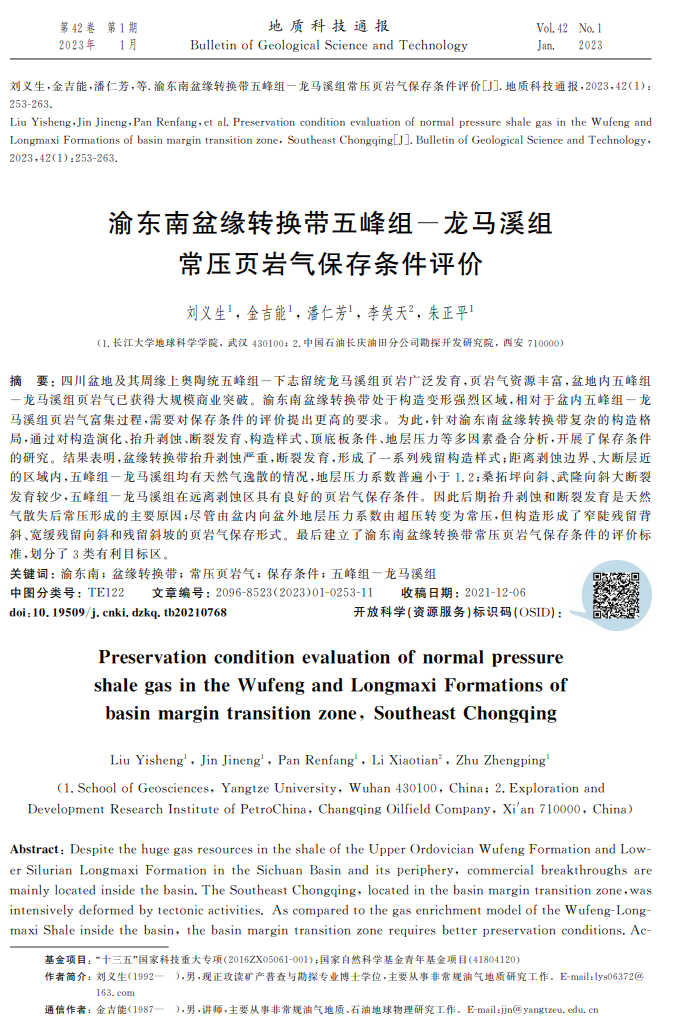 博士生刘义生在地质学领域期刊《地质科技通报》期刊发表题为“渝东南盆缘转换带五峰组-龙马溪组常压页岩气保存条件评价”的研究论文。嘟嘟成人网