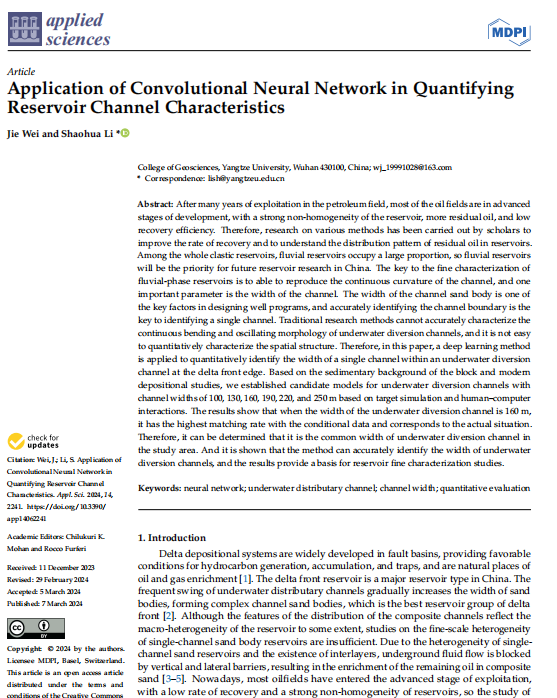 硕士生卫洁在期刊《Applied sciences》上发表了题为“Application of Convolutional Neural Network in Quantifying Reservoir Channel Characteristics”的研究论文。嘟嘟成人网