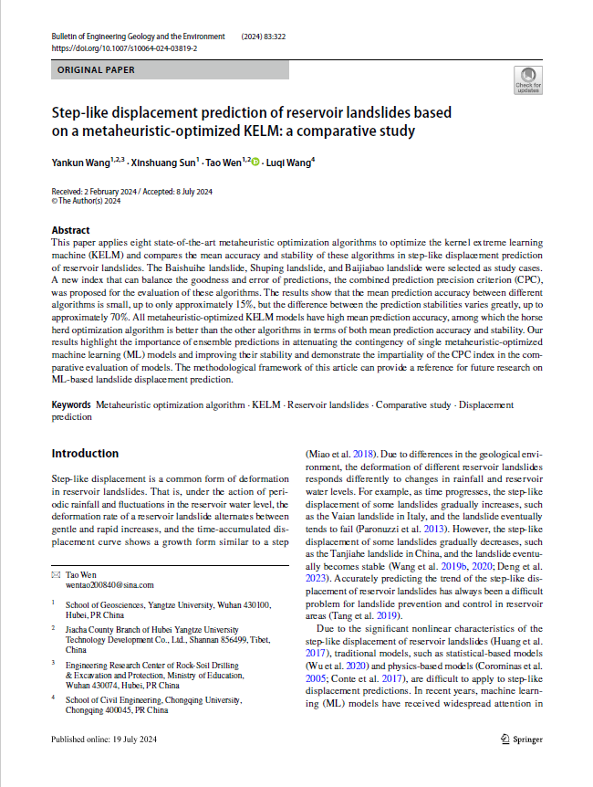 教师王艳昆副教授以第一作者身份在2区SCI期刊《Bulletin of Engineering Geology and the Environment》发表题为《Step-like displacement prediction of reservoir landslides based on a metaheuristic-optimized KELM: a comparative study》的研究论文。嘟嘟成人网