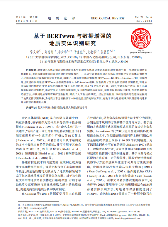 刘远刚团队硕士研究生章文琦在《地质论评》发表了题为《基于BERTwwm与数据增强的地质实体识别研究》的研究论文,嘟嘟成人网