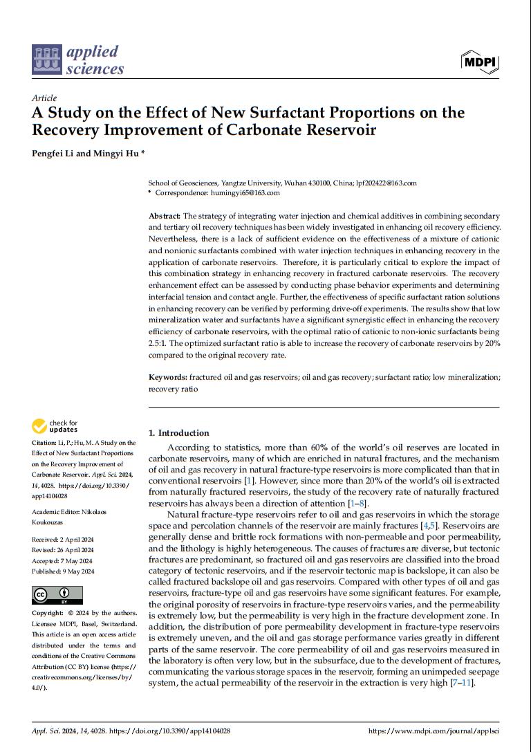 2021级硕士生李鹏飞在期刊《Applied Sciences》上发表了题为“A Study on the Effect of New Surfactant Proportions on the Recovery Improvement of Carbonate Reservoir”的研究论文。嘟嘟成人网