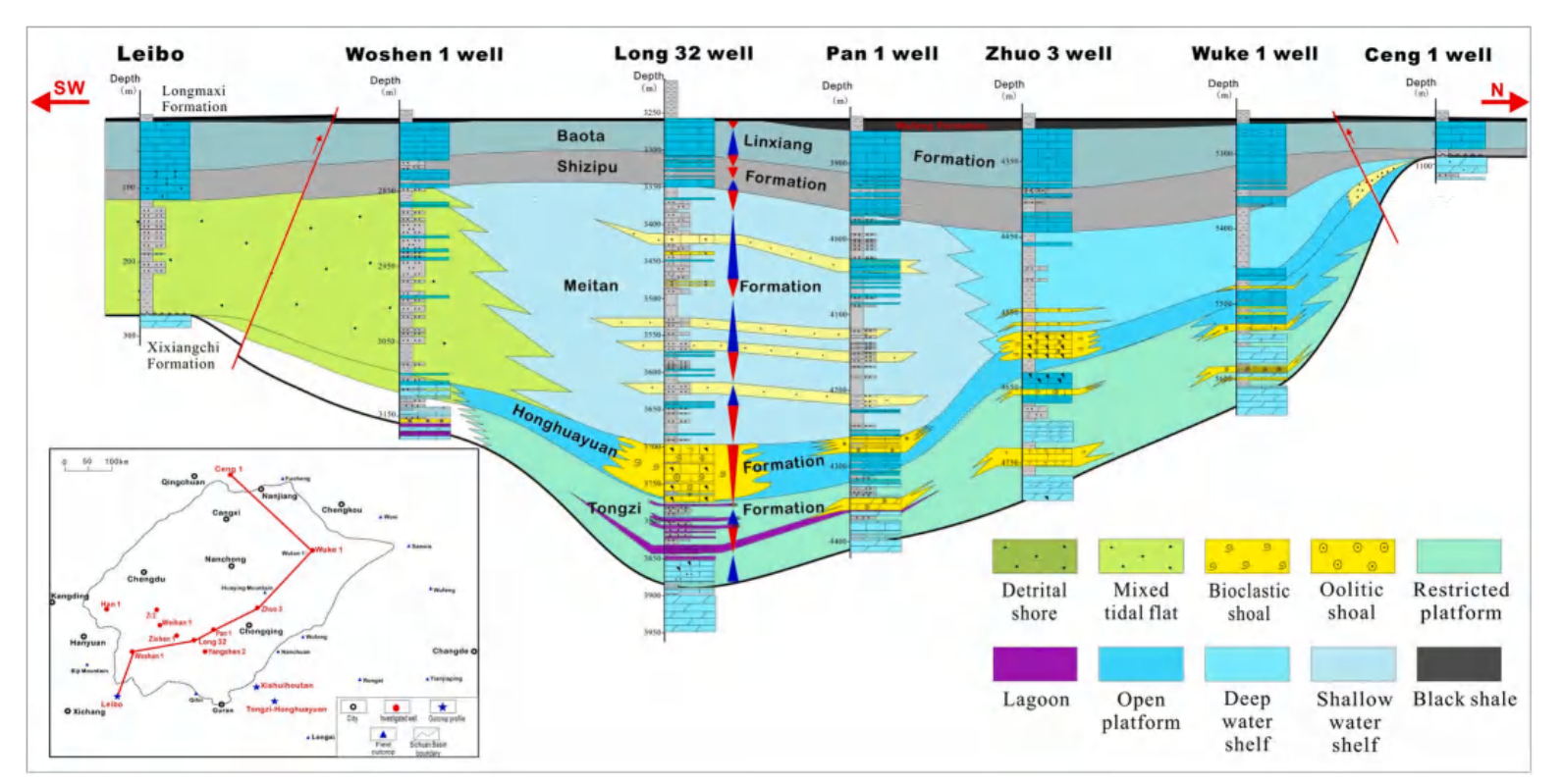 图1 四川盆地连井大剖面层序地层和沉积相侧向展布图