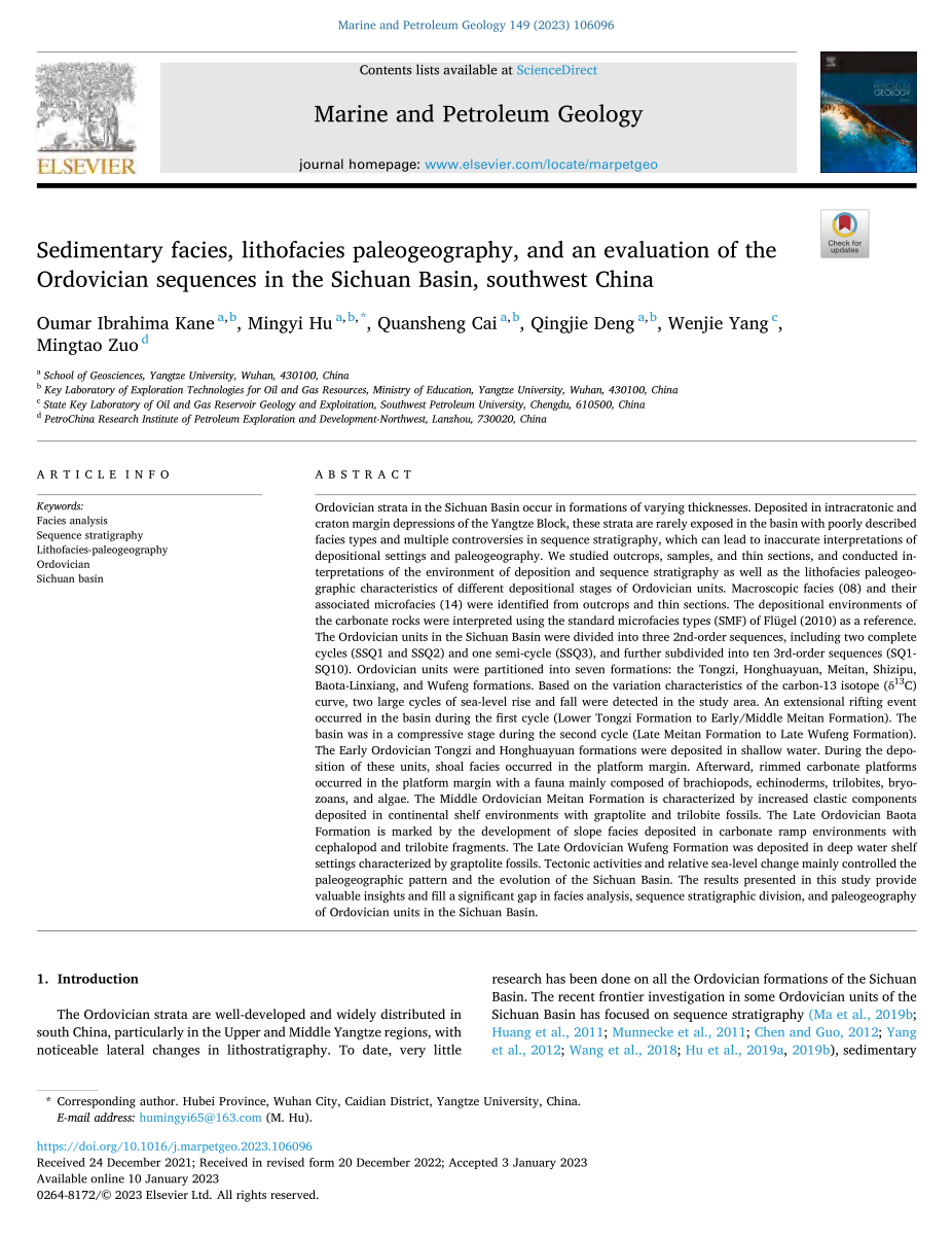 胡明毅教授团队在石油地质领域主流期刊《Marine and Petroleum Geology》发表了题为“Sedimentary facies, lithofacies paleogeography, and an evaluation of theOrdovician sequences in the Sichuan Basin, southwest China”的研究论文。论文基于露头、岩心、薄片观察,结合碳氧同位素等测试分析对中国西南部地区四川盆地奥陶系层序地层、沉积体系和岩相古地理开展了研究,将四川盆地奥陶系划分为3个二级层序、10个三级层序(图1),系统编制了该区奥陶系岩相古地理图(图1),建立了该区奥陶系沉积演化模式,认为该区早奥陶世发育镶边台地、晚奥陶世发育缓坡台地沉积。