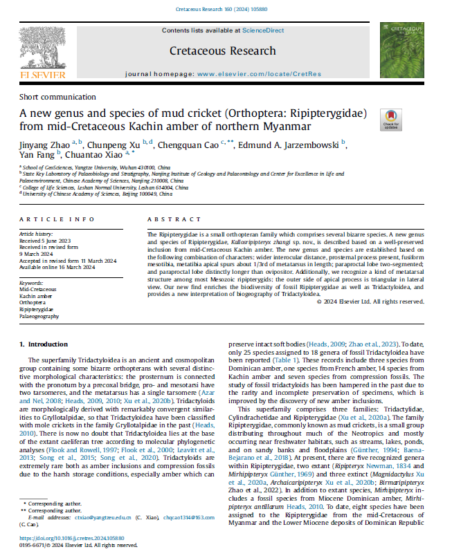 地质学专业硕士研究生赵金阳同学在在地学综合研究领域期刊《Cretaceous Research》上发表题为“A new genus and species of mud cricket (Orthoptera: Ripipterygidae) from mid-Cretaceous Kachin amber of northern Myanmar”的研究论文(图1)。嘟嘟成人网