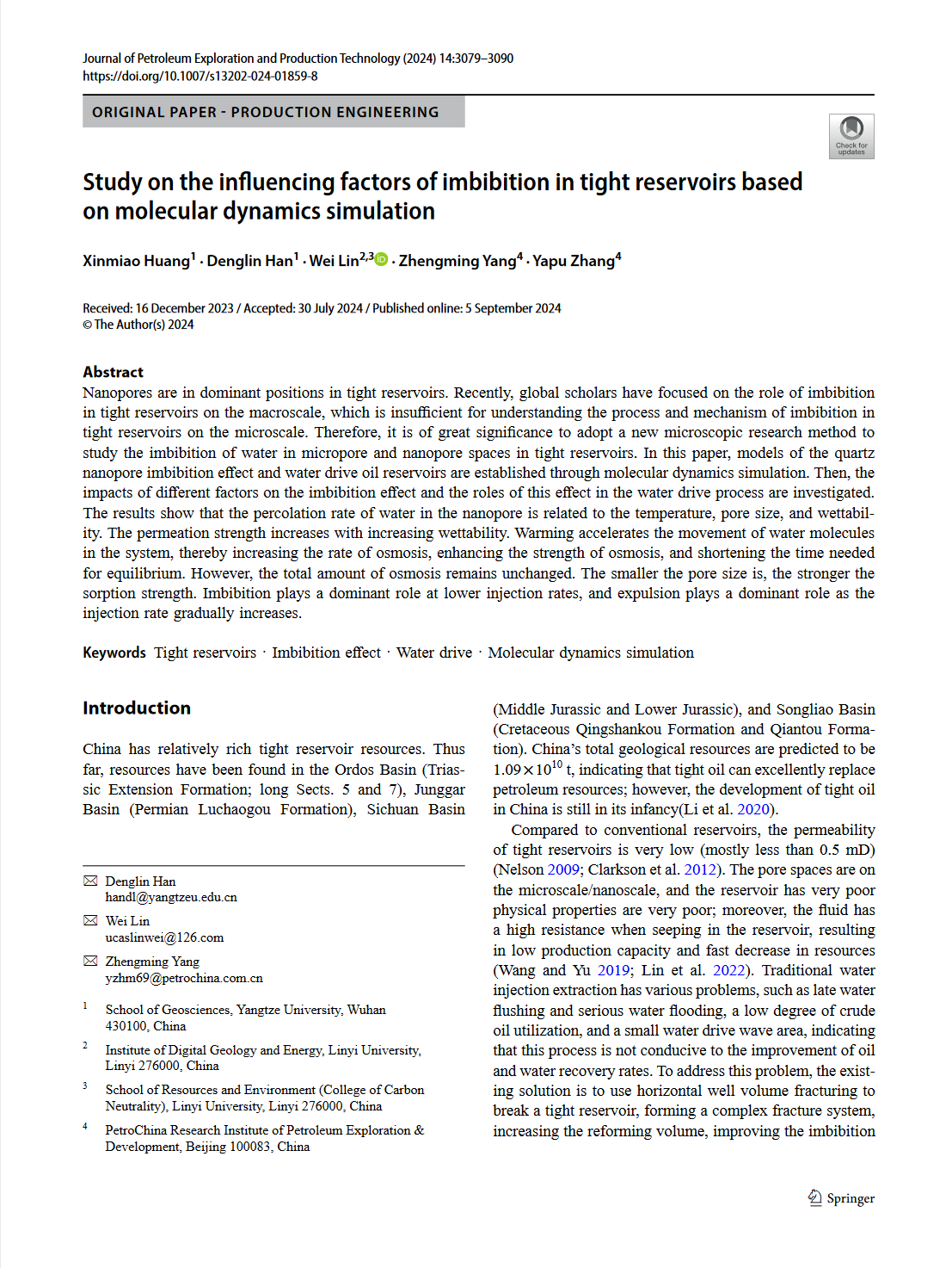 硕士研究生章黄鑫淼在《Journal of Petroleum Exploration and Production Technology》发表了题为“Study on the influencing factors of imbibition in tight reservoirs based on molecular dynamics simulation”的研究论文,嘟嘟成人网